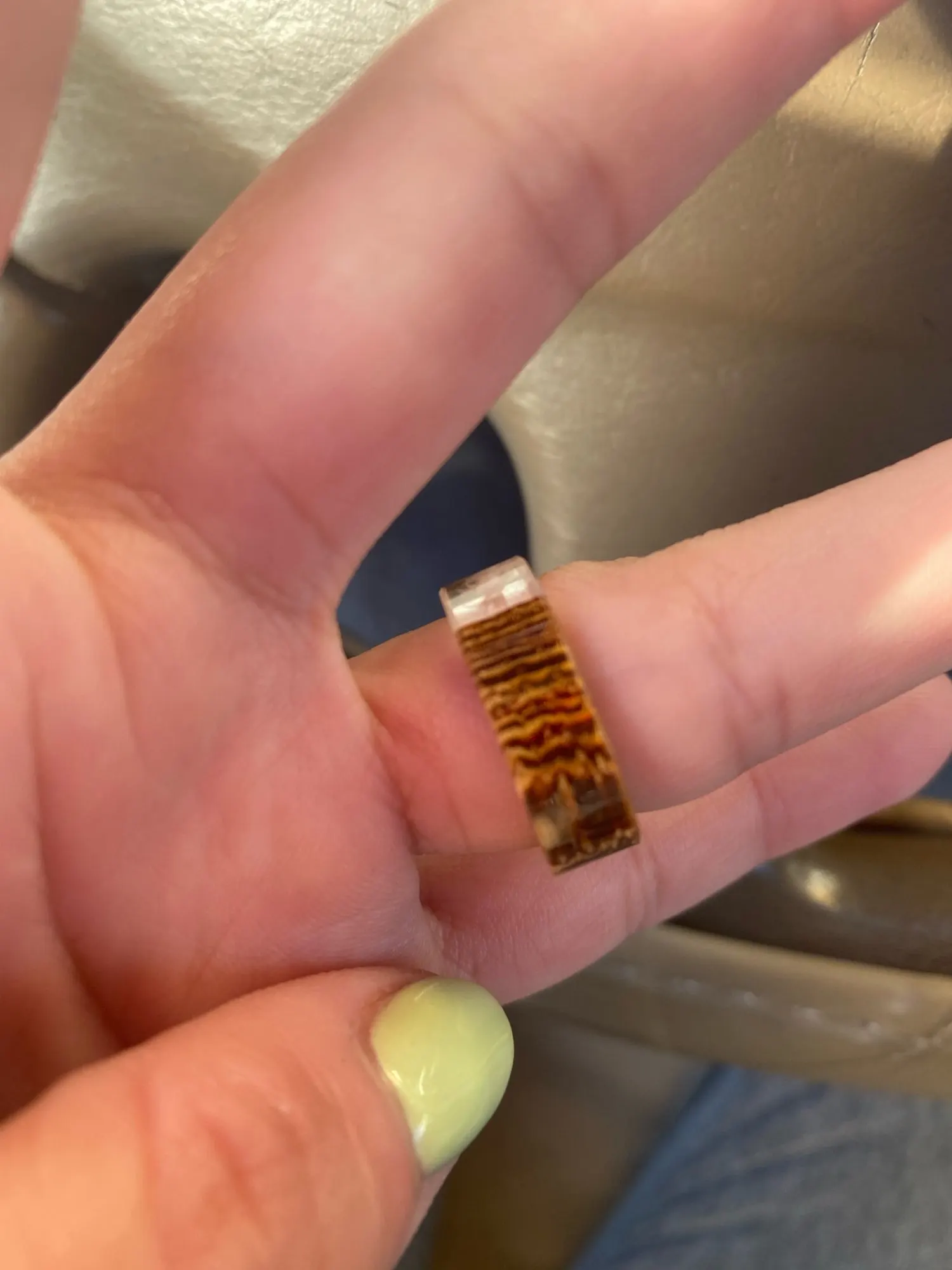 Although its colors are bold, its simple shape makes it an appropriate choice for both subdued days at the office and evenings out with friends or a loved one… anytime you want to look trendy and fashionable. Choose this decorative band if you’re looking for a versatile addition to your daily apparel… One that shows your nature as an easy-going, simple-yet-complex, always-trendy modern woman. See more in the wood rings section.
